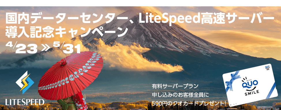 『LiteSpeed』提供開始および国内サーバー申し込みが可能になったことを記念して、有料サーバープラン申し込みの方に500円分のクオカードをプレゼントいたします。