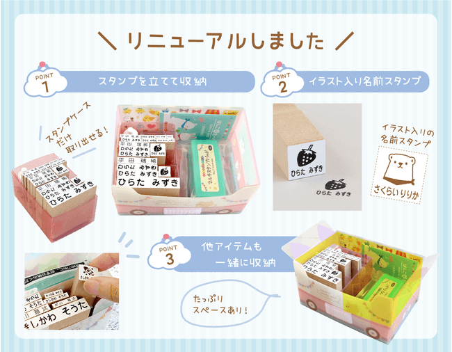 イラストスタンプとケースは、すべて当店のイラストレーターとデザイナーが作成したオリジナルです。デコシールつきのかわいい収納ケースもポイントです。