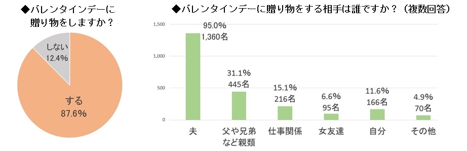 まずはバレンタインデーに関する調査です。「バレンタインデーに贈り物をしますか?」の質問に、87.6%が「する」と答えました。次に「バレンタインデーに贈り物をする相手は誰ですか?(複数回答)」と聞いたところ、「夫」が95.0%、「父や兄弟など親類」30.7%、「仕事関係」15.1%、「自分」11.6%と続きます。また、「その他」のフリー回答では、「母」「ご近所さん」「男友達」などが挙がりました。