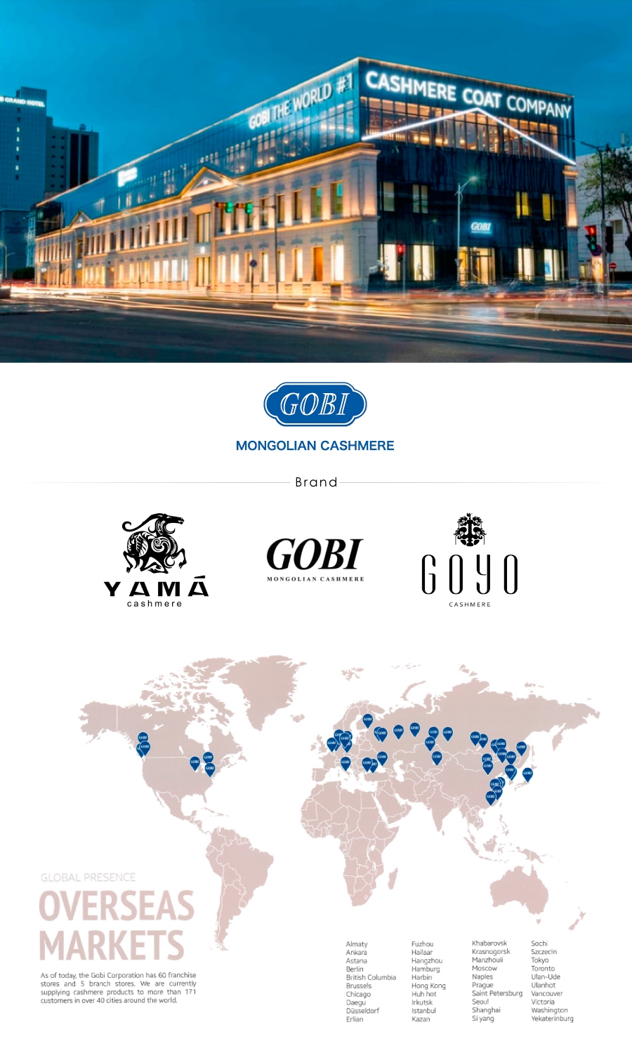 近年、インターネット上では中国製の安価なカシミヤ製品が出回っていますが、それらとは比べものにならない上品なツヤと極上の肌触り。デパートや高級セレクトショップで扱っている高価なカシミヤ製品と比べても同レベルです。それはそのはず。ヨーロッパやアメリカを中心に世界のカシミヤブランドへカシミヤ原毛を提供しているのは、この「GOBI CASHMERE(ゴビカシミヤ)」なのです。(全てのカシミヤブランドへ提供しているわけではありません)
