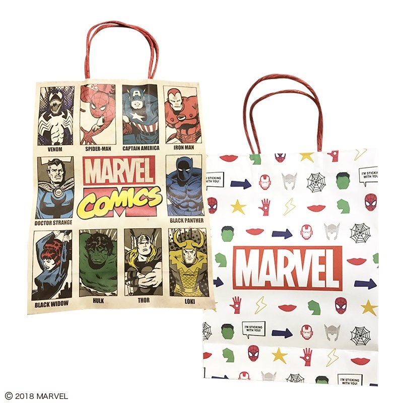期間中、商品をご購入いただいた方に、マーベル・コミックスデザインのショッパーを数量限定でプレゼントいたします。表面はスタイリッシュなマーベルキャラクター、裏面はアイコンモチーフがポップな両面デザインとなっております。