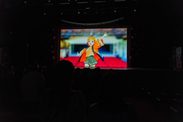 スクリーンにはこのらんらんホールを背景に、フェスのための衣装に着替えたAqoursの姿が! 我々助っ人たちに向けて、今から1時間でフェス会場の準備を終えなければならないことを教えてくれます。