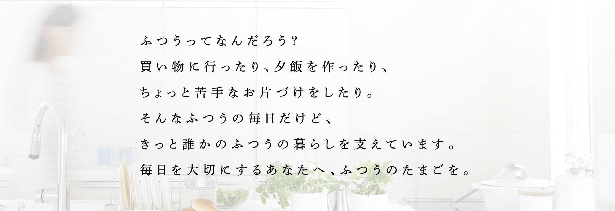 買い物に行ったり、夕飯を作ったり、ちょっと苦手なお片づけをしたり、そんなふつうの毎日だけど、きっと誰かのふつうの暮らしを支えています。毎日を大切にするあなたへ、ふつうのたまごを届けたい。そんな想いで開発した、たまごです。