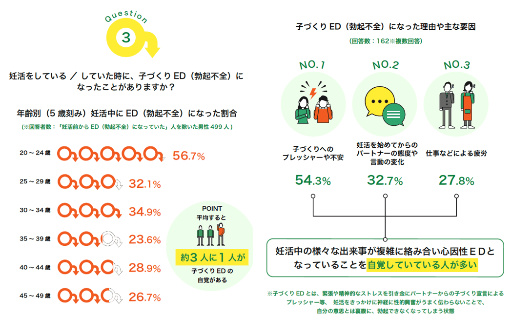 EDの原因には、身体的なものと精神的なものがありますが、身体的問題を抱えることの少ない若い世代が最も悩みを抱えているという結果からも、子づくり目的の義務的なセックスが精神的に大きな負担になってしまっていることが伺えます。