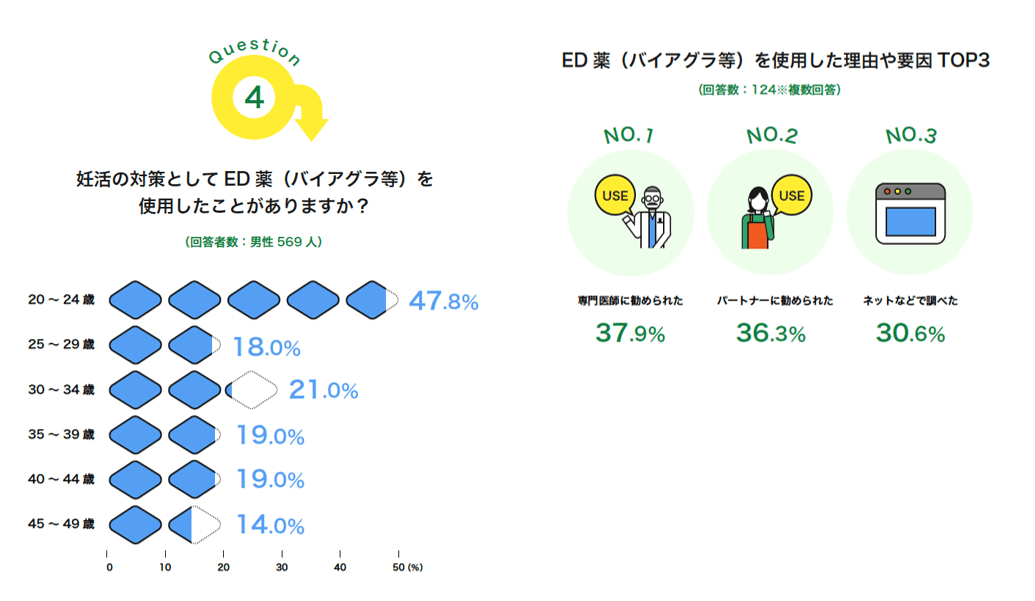 「妊活の対策としてED薬(バイアグラ薬等)を使用したことがありますか?」という質問では、20~24歳の使用率が47.8%と前項の「EDとなった」同様、ほかの世代よりも高いことが明らかになりました。(全年代平均 23.1%)