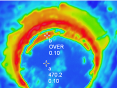物体から放射される赤外線強度は、プランクの法則として知られる式で定量的に表現され、波長依存性があることが分かっています。本技術では、常温である周囲環境からはほとんど放射されず、測定対象からのみ放射される赤外線波長帯を利用することにより、外乱の影響を受けることなく温度を計測することができます。その結果、これまで熱電対などの温度計により接触、且つ点でしか行えなかった金属等の温度計測を、非接触、且つ温度分布として捉えることが可能となります。例えば、アルミニウムの場合、200℃以上の温度を±4%の精度で計測することができます。