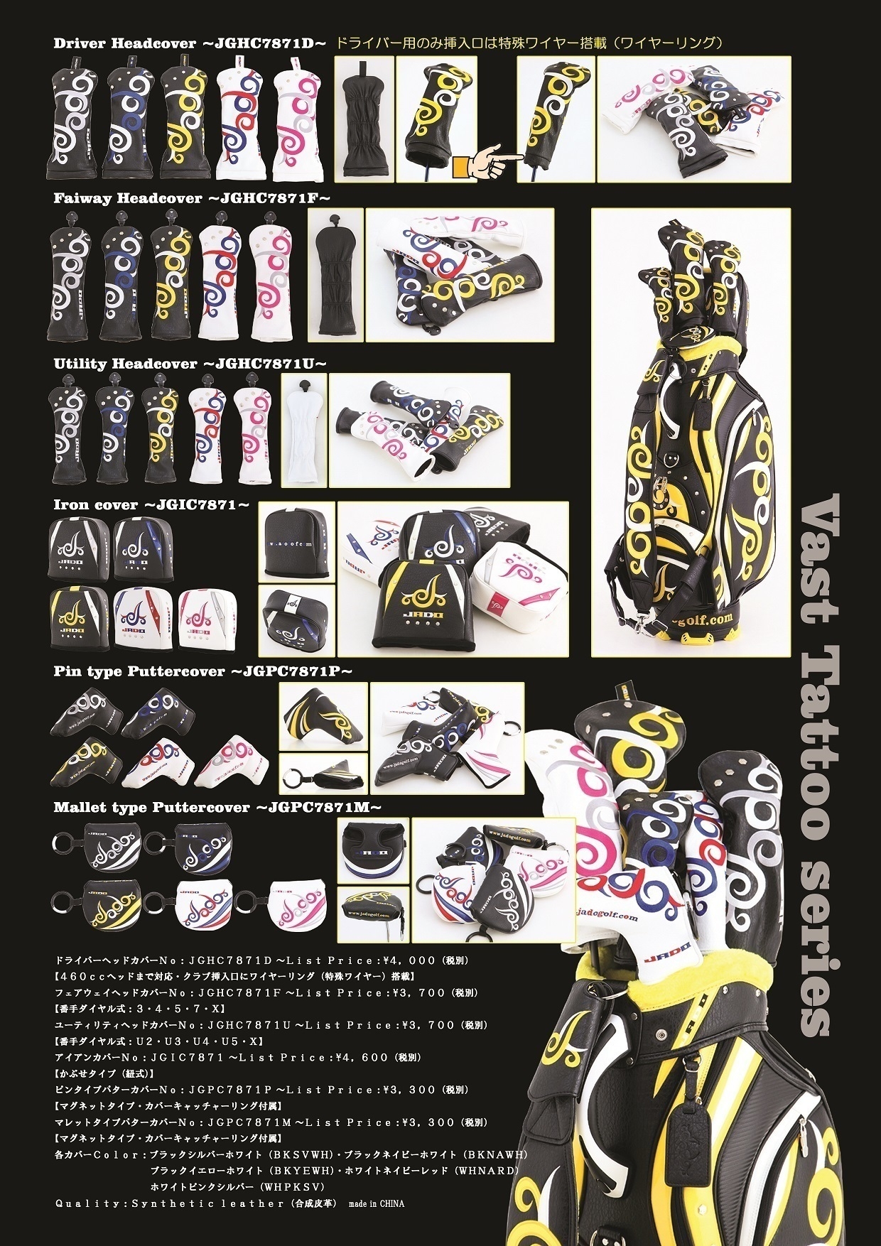 新シリーズ「Vast Tattooシリーズ」のキャディーバッグ・ヘッドカバーは、ゴツいタトゥー柄デザインが特徴。色鮮やかなカラーで、ゴルフ場でキャラ立ち間違いありません。