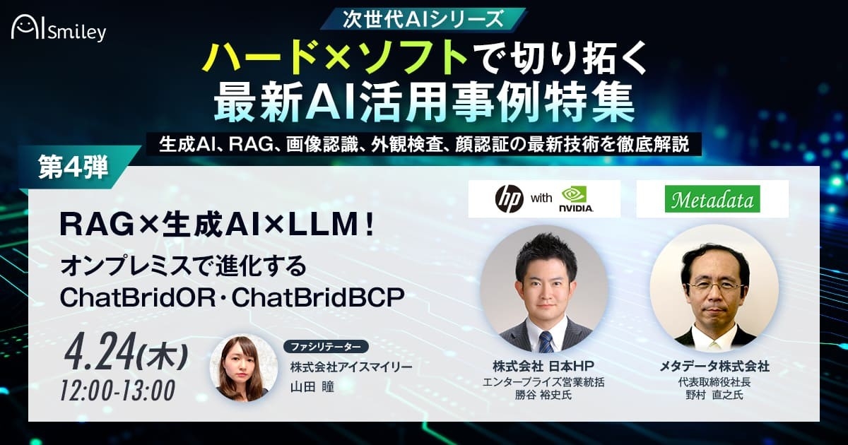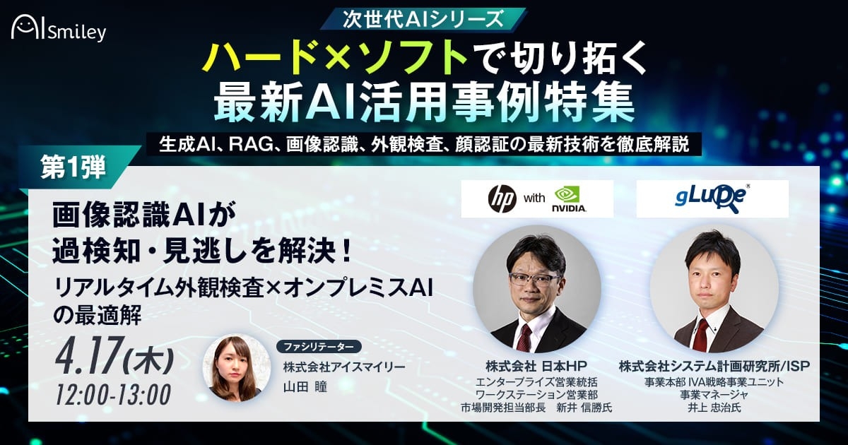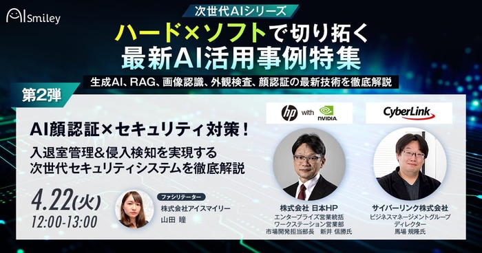 AIポータルメディア「AIsmiley」を運営する株式会社アイスマイリー(東京都渋谷区、代表取締役:板羽晃司)は、日本HPと最先端のAI企業を迎え、2025年4月17日(木)、2025年4月22日(火)~年4月24日(木)全4回開催の【次世代AIシリーズ】ウェビナーを開催します。