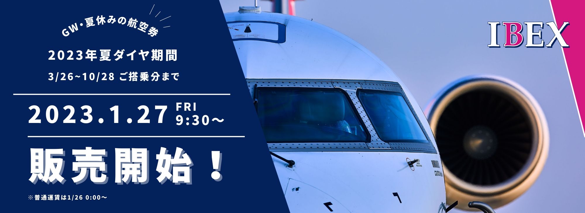 アイベックスエアラインズ株式会社(本社:東京都江東区、代表取締役社長:前澤 豊、以下IBEX)は、2023年夏ダイヤ期間(2023年3月26日(日)~10月28日(土)ご搭乗分)の航空券の販売を開始しました。