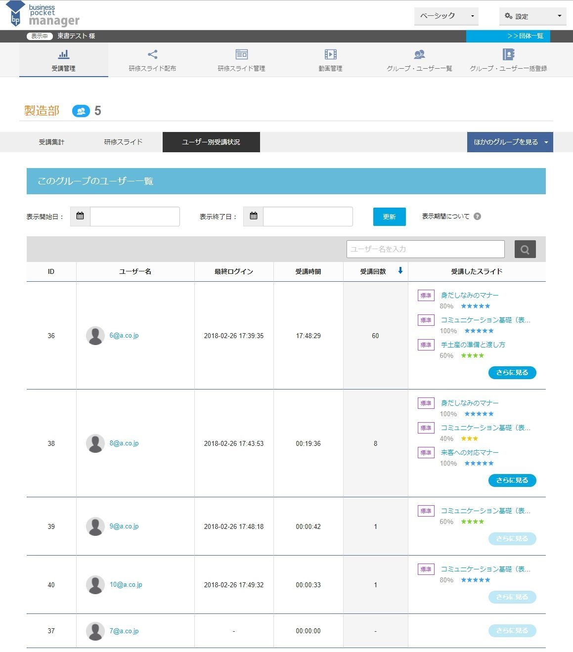 ○IDごとに受講履歴を管理することができるので、ユーザー一人ひとり、あるいはグループごとの受講状況を把握し、適切な対応を図るための強力なツールとなります。