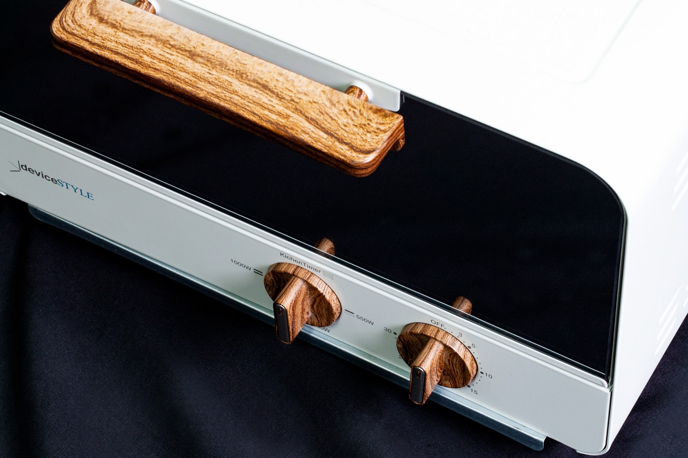 ホワイトカラーのラウンドフォルム、木目調のハンドルやセレクターなど、どこか懐かしいテイストでありながらドアにはミラーガラスを採用し、シャープさも兼ね備えた、キッチンやダイニングに調和するデザインに仕上げました。当社製ケトルKA-800Cとのデザインの相性も抜群です。