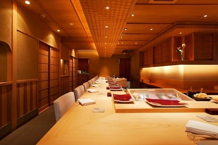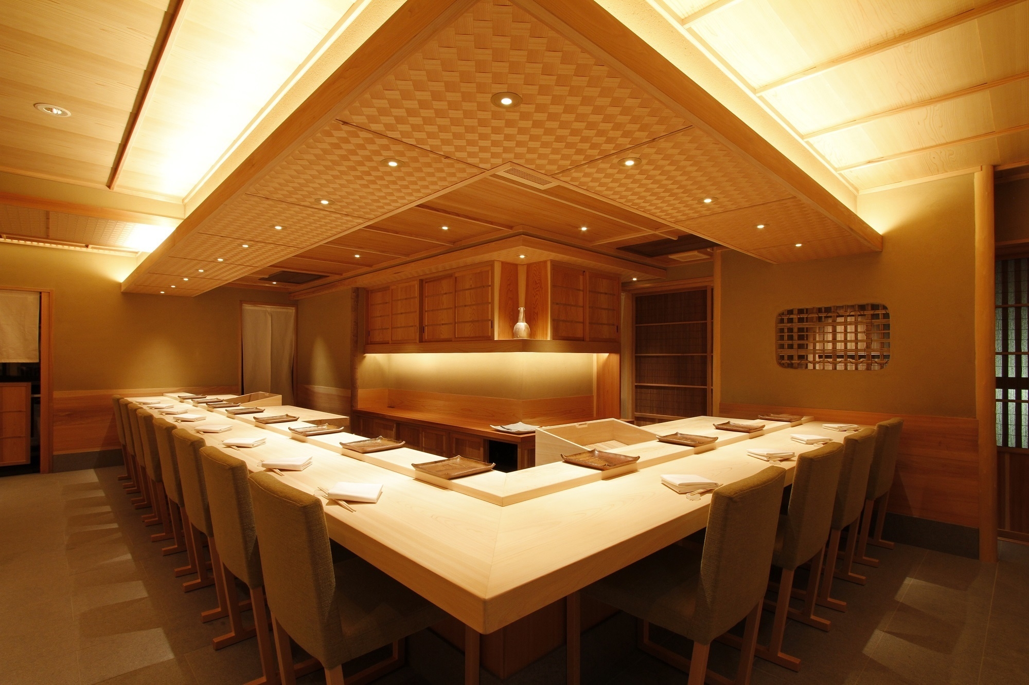 数寄屋風の落ち着いた店内は、今では素材を確保するのも難しい“長さ6mの美しい国産檜一枚板”を使用したL字型カウンターが圧倒的な存在感を放ち、大切な人と特別な時間を過ごすことができます。6名テーブル席の完全個室有り。