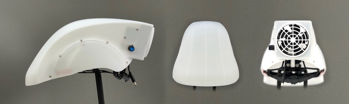 ⾦医師によるコンセプトは、「ヘッドギアタイプのパーソナルエアシールド」。施術や作業時、従事者の顔に⾶散する可能性のあるエアロゾル(⾶沫)を、電動ファンを仕込んだヘルメット状デバイスにより、額上部から強制的な送⾵によって防護する、というものです。