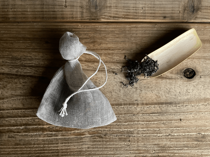 茶葉を入れて巾着をしぼり、ヒモをくるっと巻けば茶葉が出てくるのを防げます。使った後は、茶殻を取り出して、手洗いし、さっと風通しの良いところにかけて自然乾燥するだけ。