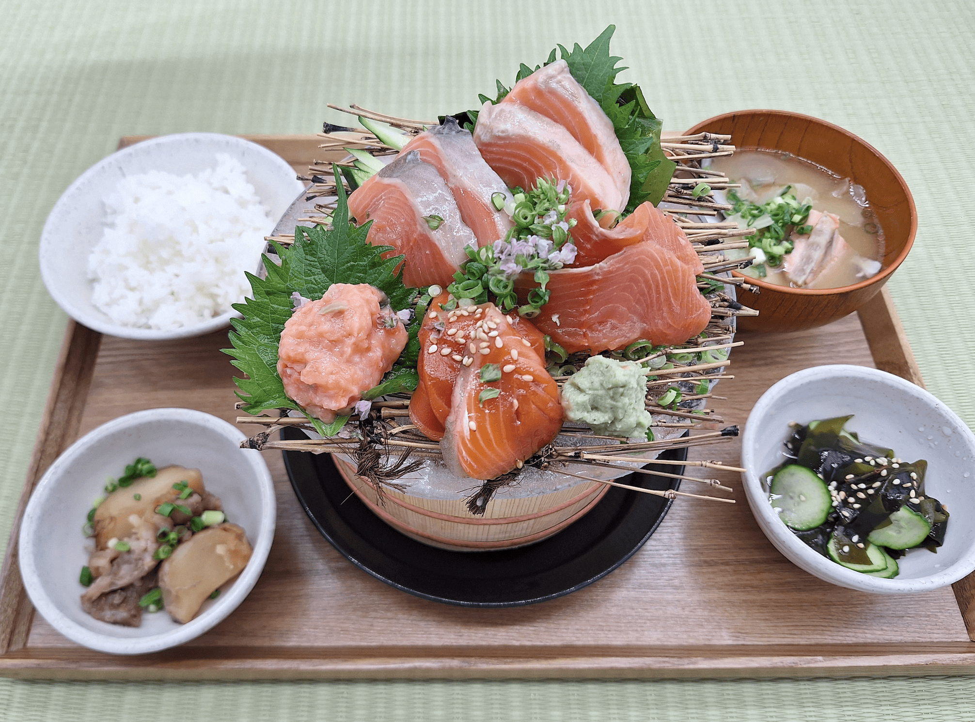 北海道産の「ますのすけ」「ときしらず」「サクラマス」や銀鮭のお刺身、紅鮭たたきの食べ比べお刺身定食です。夏らしい涼やかな本物の氷のお皿の上には北海道で貴重なサーモン、マスを使った贅沢な食べ比べをご用意。思う存分にサーモン・マスをご堪能ください。鮭の出汁が効いた鮭汁も絶品です。