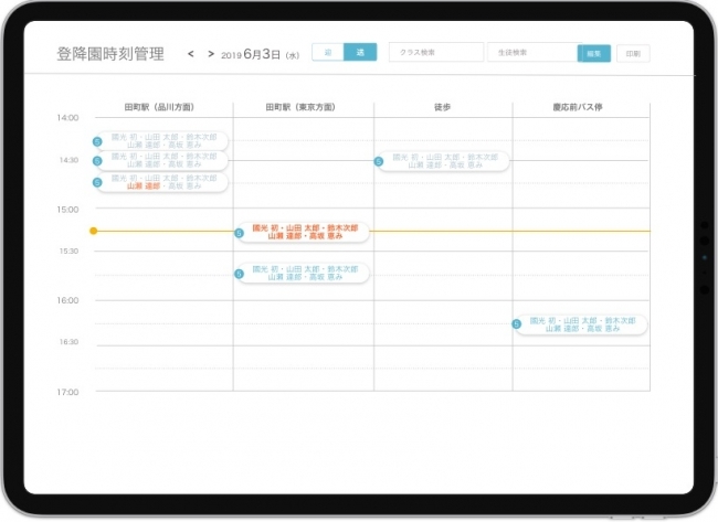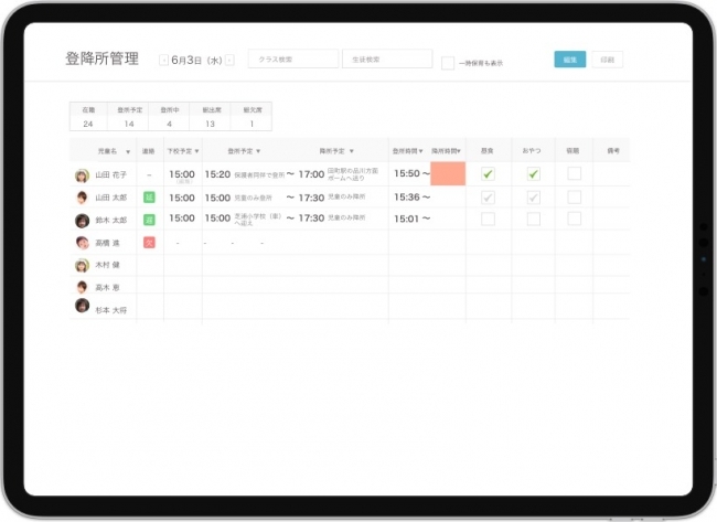児童毎の下校時間・降所時間、登降所方法などが一覧で表示され、降所時間順/出席番号順など並び替えも自由に行えるため、児童管理の効率が大幅に向上します。