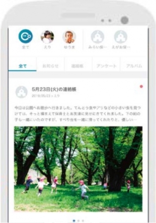 保護者向けの機能としては、専用アプリを通して施設との連絡機能のほか子どもの成長管理や写真アルバム、保育料の支払い支援といったサービスを展開しています。
