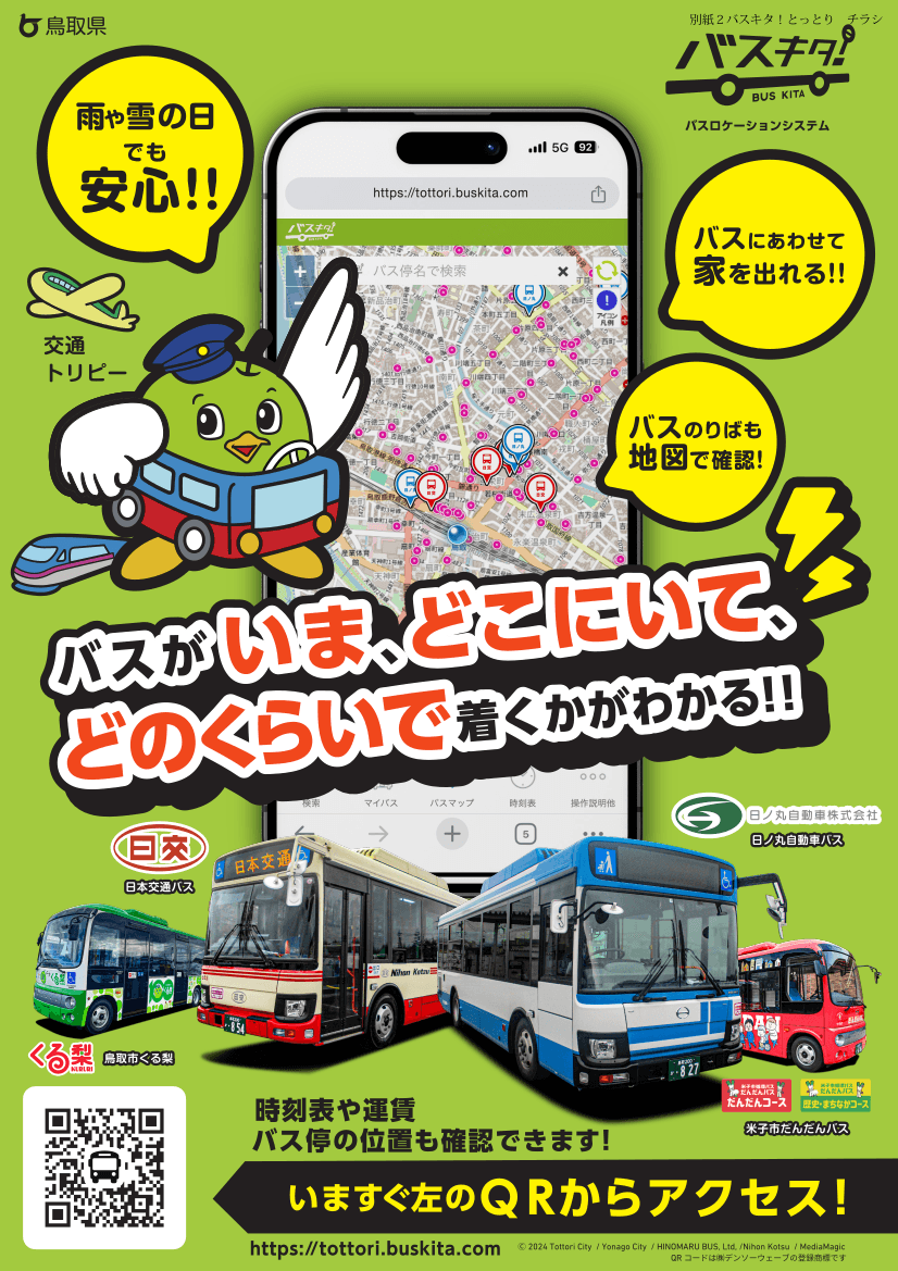 ジョルダン株式会社(本社:東京都新宿区、代表取締役社長:佐藤 俊和、以下「ジョルダン」)は、2024年2月22日(木)より、鳥取県内の路線バス事業者(日本交通株式会社、日ノ丸自動車株式会社)、鳥取市循環バス及び米子市循環バスのバス位置情報が確認可能なバスロケーションサービス「バスキタ!とっとり」を、地域住民及び訪日外国人向けに提供を開始しました。