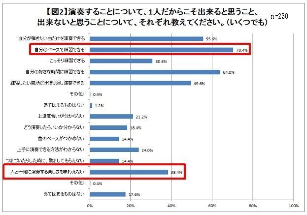 また、演奏経験のある人に対し、一人で演奏することについてどの様に感じているかを尋ねたところ、一人だからこそ出来ると思うことについては「自分のペースで練習できる」という回答が多い一方で、一人だと出来ないと思うことについては、「人と一緒に演奏する楽しさを味わえない」という回答がそれぞれ最も多い結果となりました。【図2】