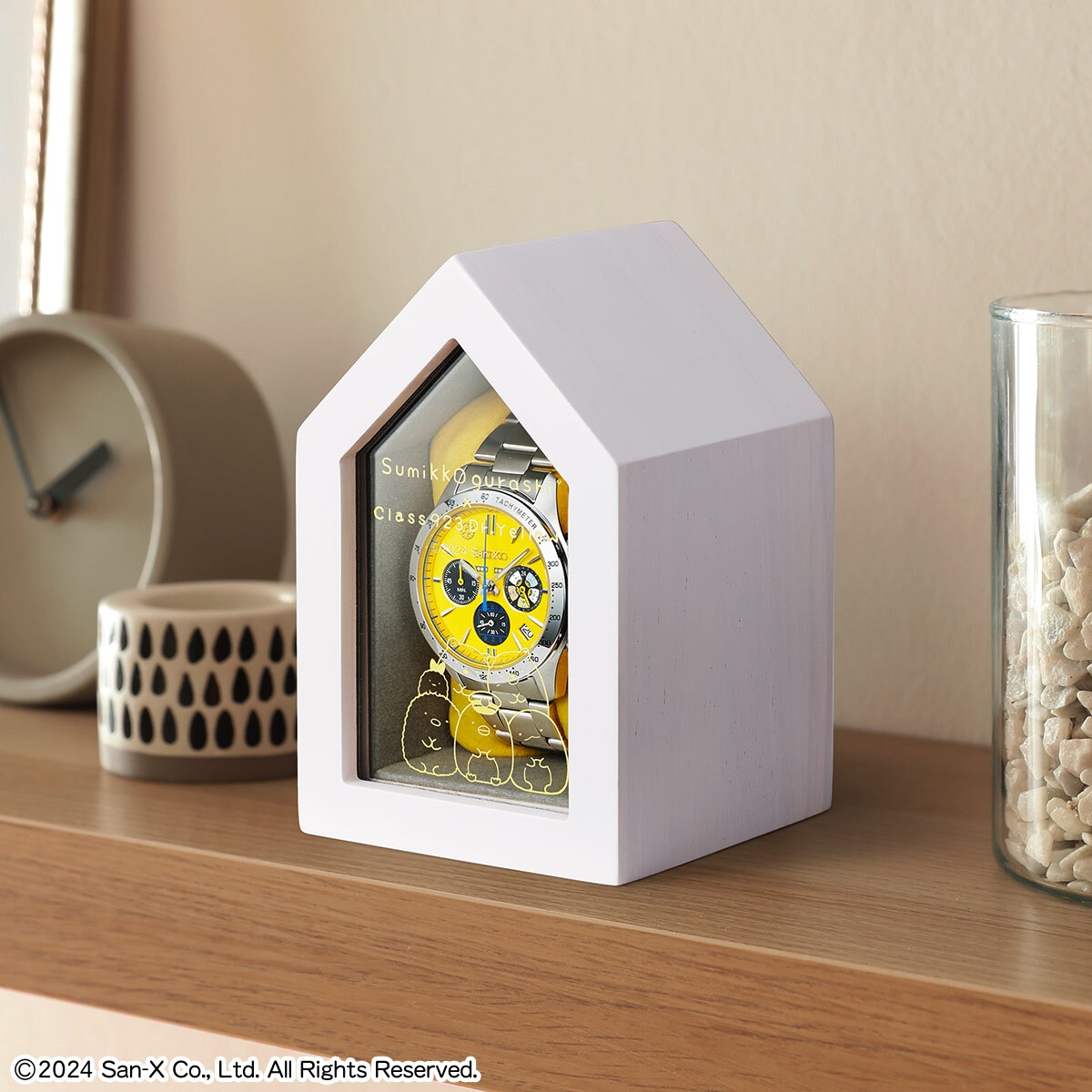 腕時計は限定5000点。車両基地をイメージした、木製の特製ボックスに収めてお届けします。アクリル窓には、ぎゅっと寄り添うすみっコたちがデザインされました。
