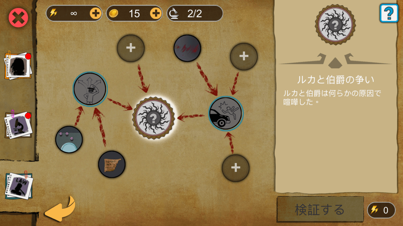 一つの事件には複数の糸口がある、独創的なマインドマップを使って事件の真相を推理してみよう。分析できた証拠の中から、犯行と関係のあるものを選んでね!選択した物証が正解だと推理成立だよ!