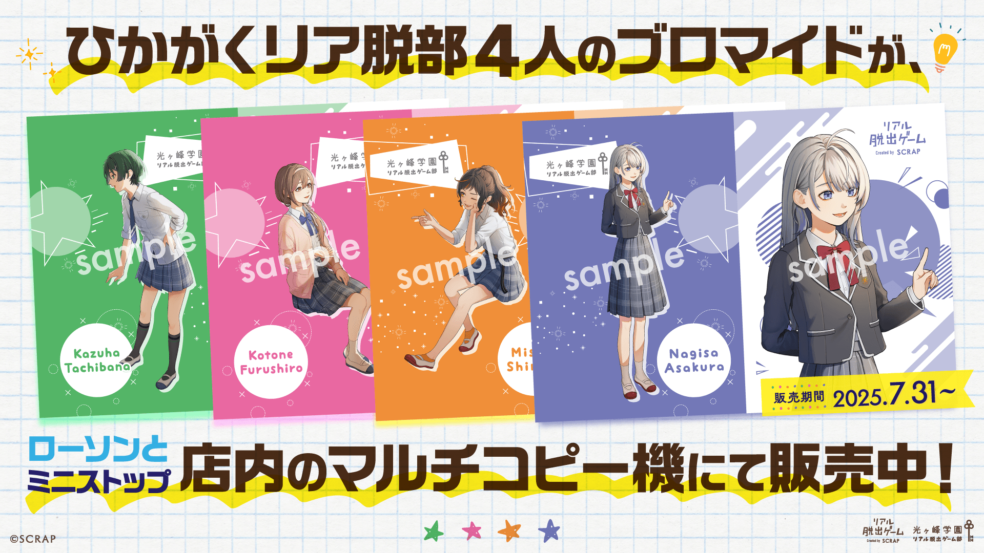 全世界で累計1,490万人以上を動員しているリアル脱出ゲームを企画制作する株式会社SCRAP(本社:東京都渋谷区、代表:加藤隆生)は、新作リアル脱出ゲーム『時が交差する夏祭りからの脱出』の開催を記念して、本日7月31日(木)より、全国のローソンおよびミニストップ店内マルチコピー機で「光ヶ峰学園リアル脱出ゲーム部」のオリジナルブロマイドを販売いたします。