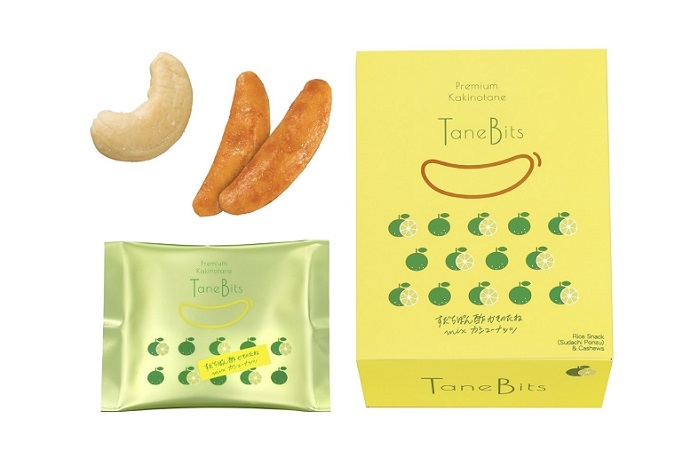 『タネビッツ すだちぽん酢』はいつもの柿の種を、柑橘の爽やかな香りと酸味、鰹や昆布の旨みのあるぽん酢醤油で、さらに味付けをして仕上げました。爽やかな風味が特徴の徳島県産すだちの果汁パウダーを使用した、さっぱりとした味わいで夏にぴったりの柿の種です。
