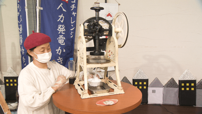 熱々の焼き芋はさすがに夏には売れないため、かき氷の販売をはじめたいも子さん。自転車のペダルを漕いで氷を削るエコロジーでユニークな仕掛けと、子どもたちの健康を考えた無添加シロップに注目です。