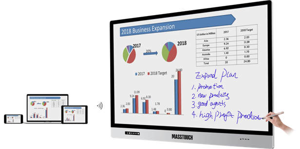 マスタッチIFPDはコラボレーション活性化の中心的ツールです。同じ部屋にいても、社外にいてもチームワークがより効率的になります。参加者は自分の個人用デバイスを使ってマスタッチIFPD上のコンテンツを簡単に共有できます。巨大なタッチスクリーンに書く、編集する、描くことで、ダイナミックなプレゼンテーションと創造的なブレーンストーミングを可能にします。使いやすいアノテーション機能は対話を容易にします。ビデオ会議アプリケーションを介して仮想チームを構成できます。 マスタッチIFPDは、オフィスコラボレーション用に最適です。