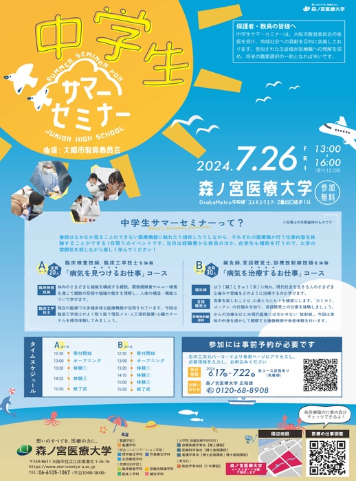 森ノ宮医療大学(大阪市住之江区、学長:青木 元邦)では7月26日(金)13:00~16:00に、中学1~3年生を対象に医療の仕事を体験いただけるイベント「中学生サマーセミナー」を開催します。保護者、ご家族の方も同伴可、もちろん1人でも友達同士でも参加できます。聞いたことはあるけど詳しくは知らない、そんな医療のお仕事を知るチャンスです。臨床検査技師、臨床工学技士、診療放射線技師、鍼灸師、言語聴覚士の5つの職種(体験プログラム)から1つ選んで、体験いただけます。参加費は無料ですのでこの機会にぜひご参加ください!