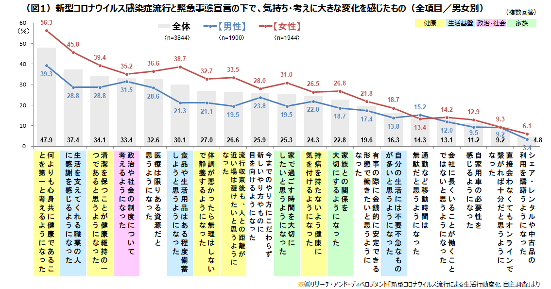 新型コロナ感染症流行下で、自分の気持ちや考えに大きな変化を感じたTOP3は、「何よりも心身共に健康であることが第一」「生活を支えてくれる職業の人に感謝」「清潔を保つことが健康維持のひとつ」。全般的に女性の方が変化を感じている度合いが高いが、特に“健康”や “生活基盤”に関わる項目の男女差が大きい。一方、男性は、全体で4番目の「政治や社会の制度について考えるようになった」が2番目に多く選択された。