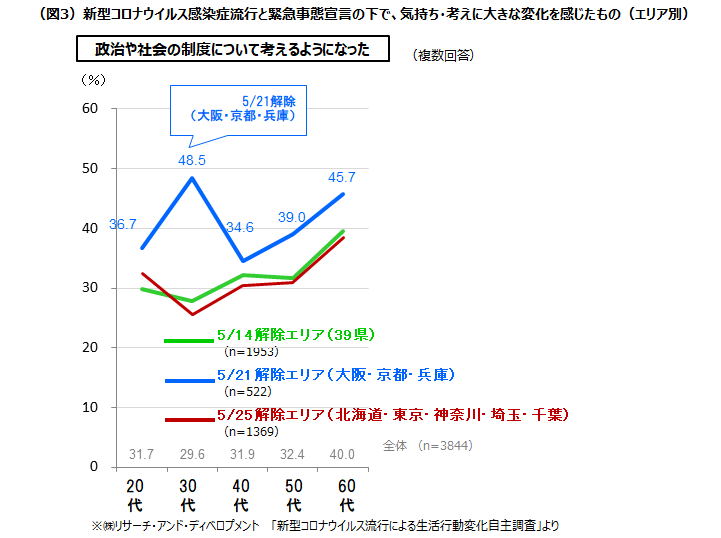 政治への関心の高まりは地域による差が顕著で、全年代で大阪・京都・兵庫エリアの意識変化が他エリアよりも大きい。特に30代ではほぼ5割に達し、全年代中最多であった。