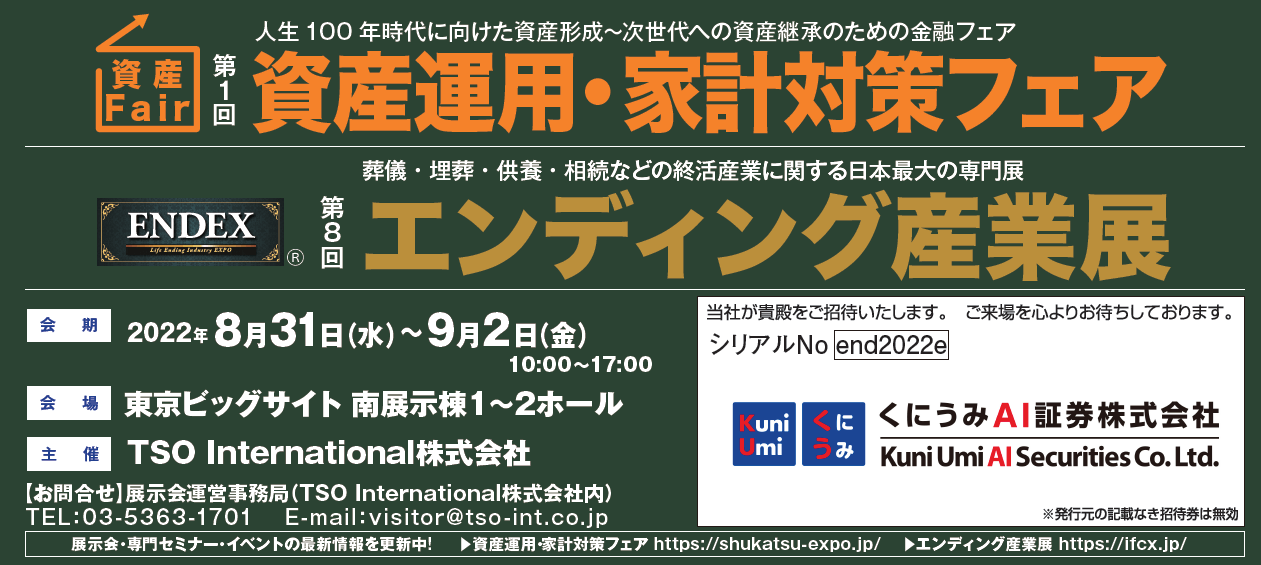 くにうみAI証券(本社:東京都千代田区丸の内、代表取締役社長:李 遠)は、東京ビッグサイトで2022年8月31日(水曜)から9月2日(金曜)まで開催される「資産運用・家計対策フェア」にて、海外ヘッジ・ファンド投資に関するブースを出展しセミナーを開催いたします。ご関心がある方は、お気軽にお立ち寄り、ご相談下さい。