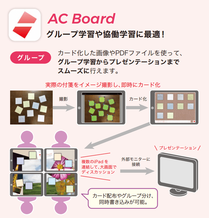 複数の端末を接続して大画面化し、写真やPDFなどをカード化してカードの分類が可能です。協働学習やKJ法などのグループ学習に最適です。