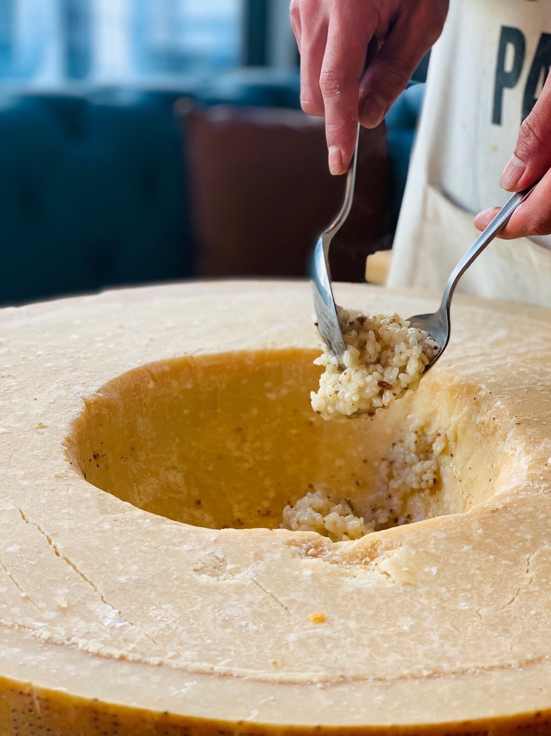 パルミジャーノチーズをくり抜いた器の中で、チーズリゾットをお客様の目の前でお作り致します。