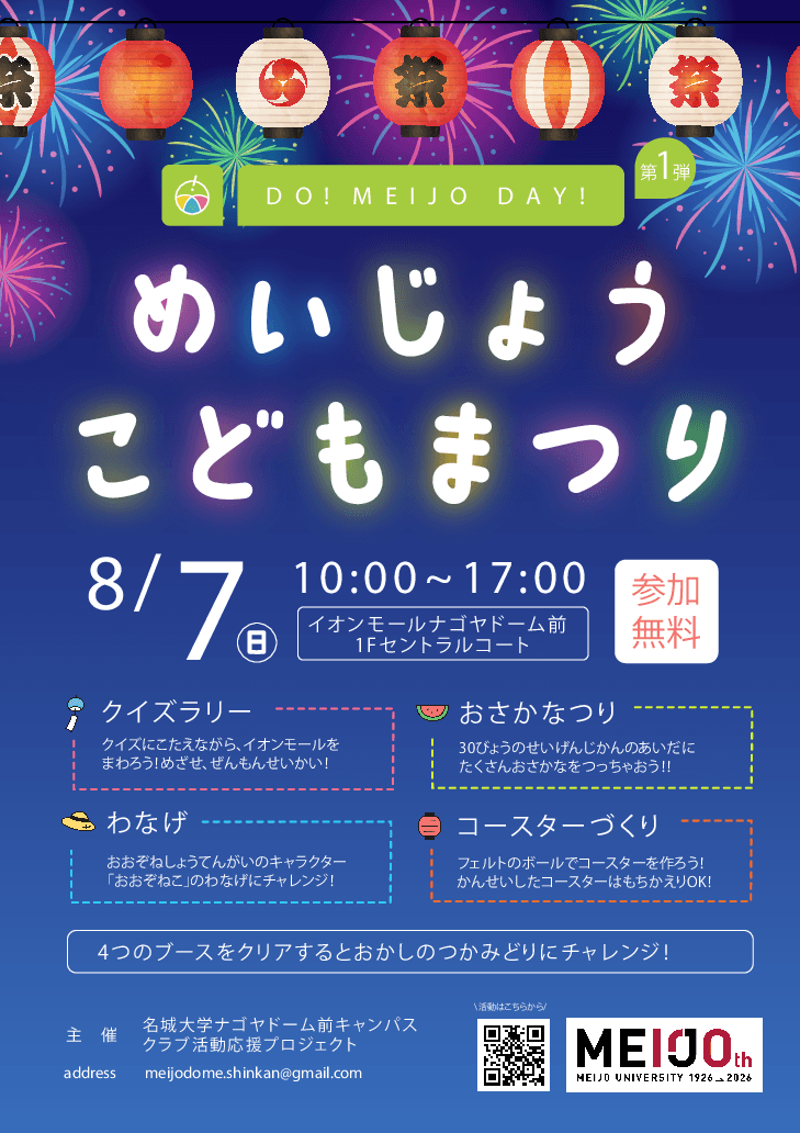 名城大学ナゴヤドーム前キャンパスのクラブ15団体に所属する学生たちが主体となり、「名城大学ナゴヤドーム前キャンパスクラブ活動応援プロジェクト」として、イオンモールナゴヤドーム前で「めいじょうこどもまつり」を開催します。学生たちがイオンモールナゴヤドーム前と連携してゼロから企画を立ち上げました。