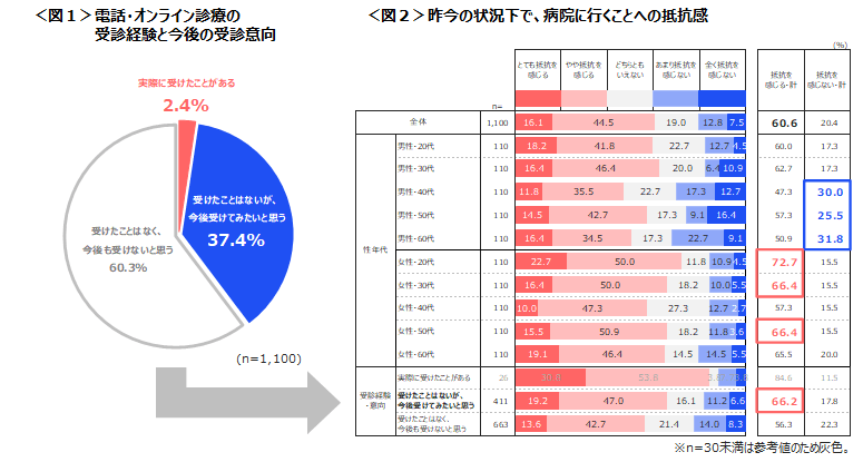 今回は、病院へ行くことの抵抗感、電話・オンライン診療の受診経験・受診意向、不安点などについて分析しています。