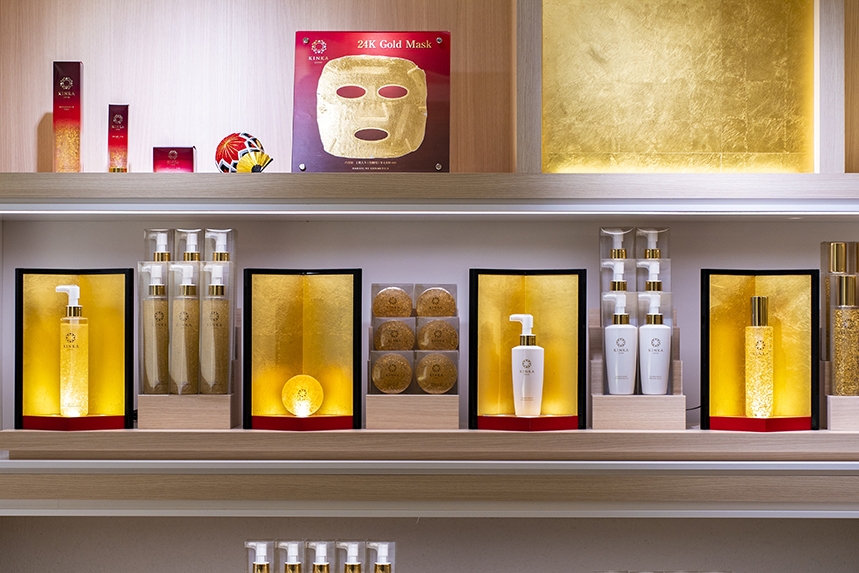 同店は箔一のロングセラー製品である化粧品ブランド 金箔化粧品「KINKA」の専門店となります。