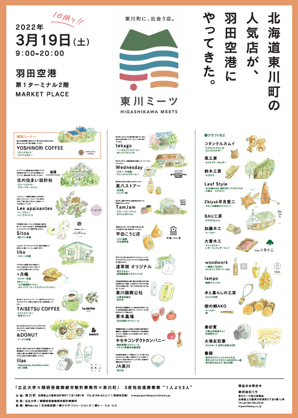 北の住まい設計社/Les apaisantes/sitoa/liko/﹅月庵/TAISETSU COFFEE/&DONUT/lilas/tekago/Wednesday/東八ストアー/TamJam/ひがしかわ観光協会/東川振興公社/青木農場/キセキコンダクトカンパニー/コタンクルカムイ/風工房/鈴木工房/Leaf Style/Zbiyak(早見賢二)/BAU工房/加藤木工/大雪木工/woodwork/lampo/木と暮らしの工房/樹の郷AKO/奥田實/大塚友記憲/YOSHINORI COFFEE/平田こうじ店
