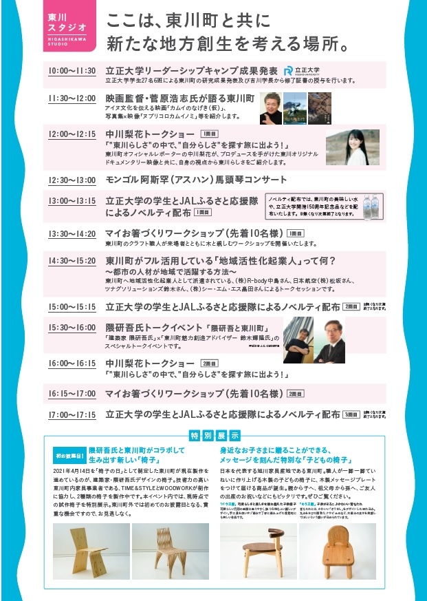 また、19日(土)の羽田空港イベントでは、建築家・隈研吾氏の東川町についてのトークショーや、映画監督・菅原浩志氏による現在製作中の映画「カムイのなげき(仮)」についてのトークショー、町内木工事業者によるお箸づくりワークショップなどを開催予定です。
