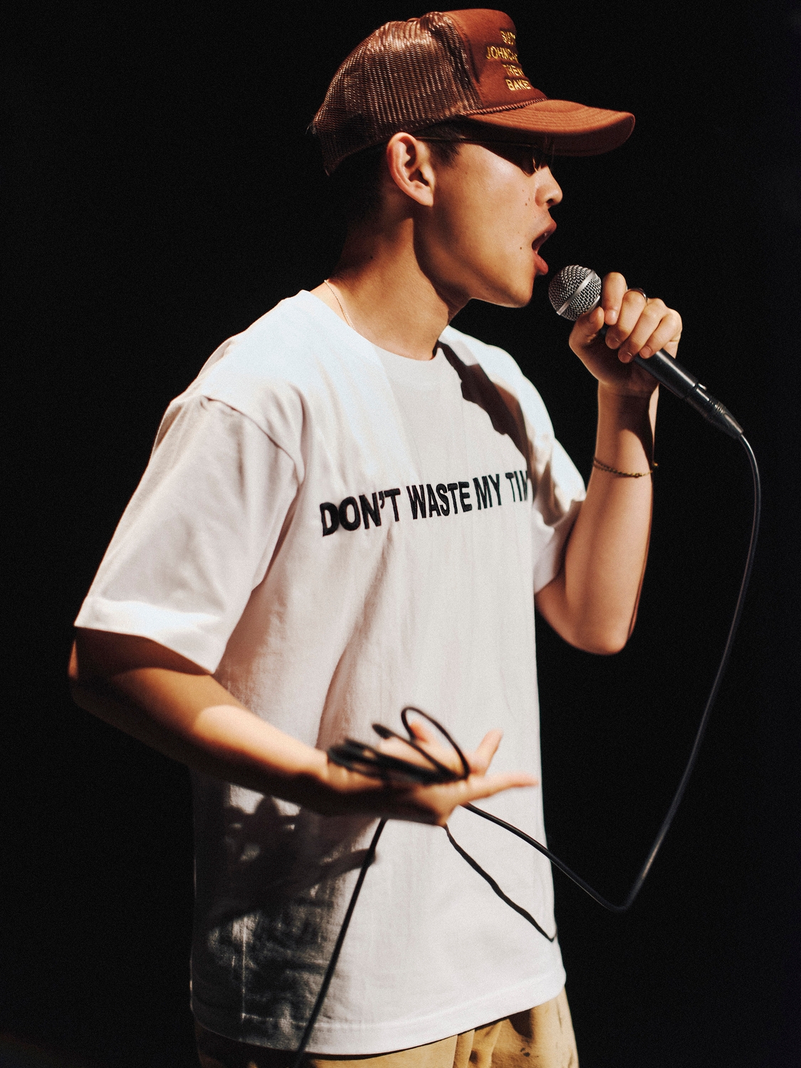 今回のコラボTシャツのデザインは、バックプリントには普段の習慣を落とし込んでみました。“Write Lyrics”とか“MAKING MUSIC”のようなミュージシャンらしいこともあれば、“Sink in Anxiety”とか“Deep in THOUGHT”みたいに不安の渦に埋もれたり深く考える自分の特性もあえて入れています。フロントには“DON'T WASTE MY TIME!! (俺の時間を無駄にするな)”とオフェンシブな文言を入れて、ちょっとまわりを牽制しつつ自分自身の今の気持ちを正直に表現しました。