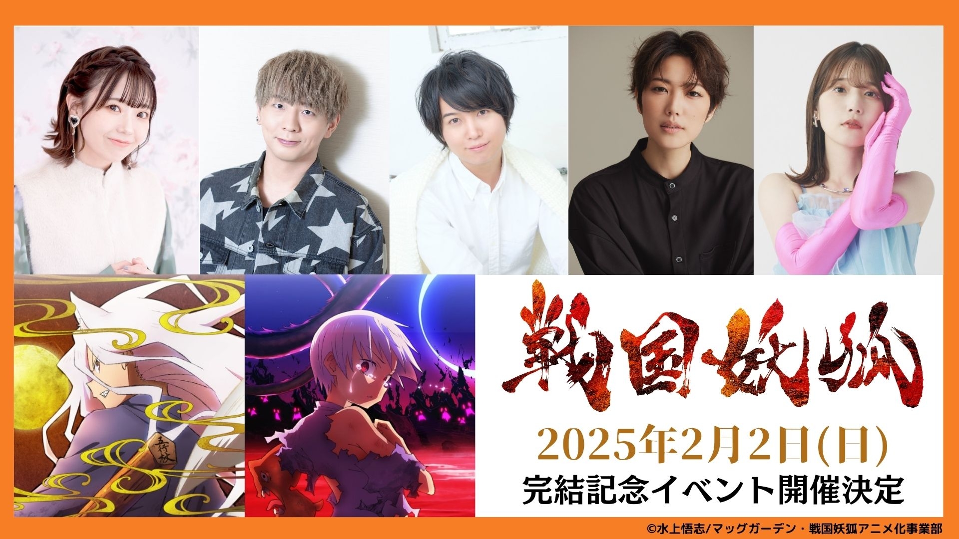 内容:2024年に全3クールにて放送されたTVアニメ「戦国妖狐」のメインキャスト陣によるエピソードトークをはじめ、アニメ本編の名場面を振り返りつつお送りする、「戦国妖狐」ファンの為のアニメ完結記念メモリアルイベント。