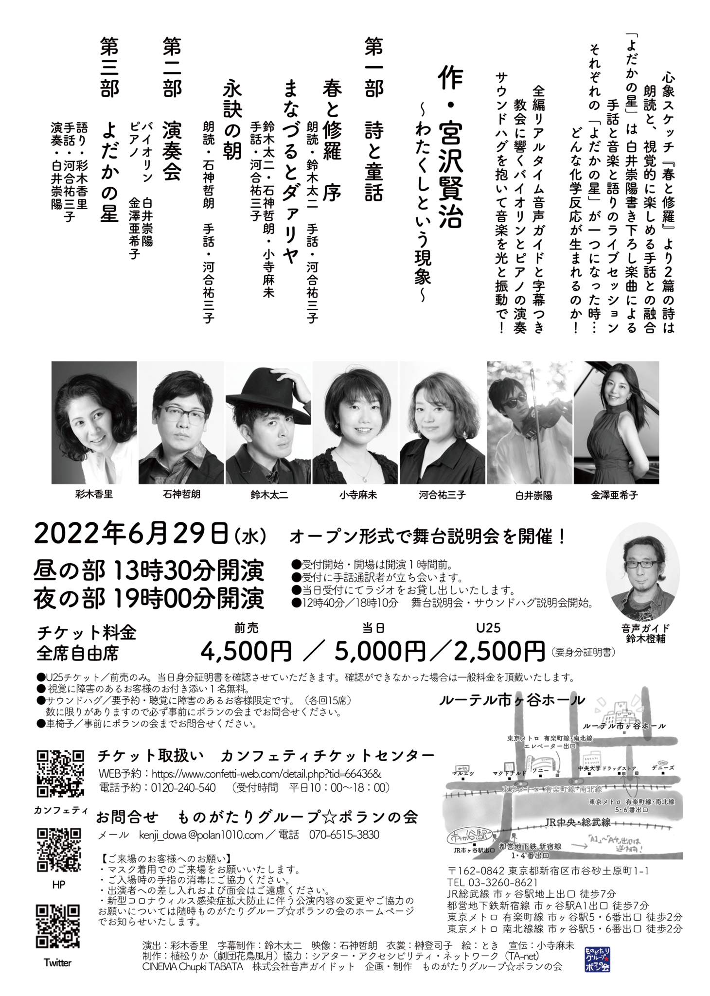 はじまりは日本で唯一のユニバーサルシアター、シネマ・チュプキ・タバタでの朗読会でした。そこで全盲バイオリニストの白井崇陽さんと出会いました。白井さんの演奏からは繊細で美しいだけではなく、とても力強い 「生きる」エネルギーをたくさん感じました。見えない白井さんが見た宮沢賢治の世界は「こころ」の部分、核心に触れていることに驚かされました。「音楽」と「語り」で一つの作品を表現することのはじまりです。 もし、ここに手話表現が加わったらどんな世界が見えるのだろうか…。