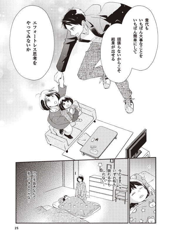 普段はあまり本を読まない人、活字が苦手という人も、ストーリー仕立てのマンガで楽しく簡単に『エフォートレス思考』を身につけることができます。