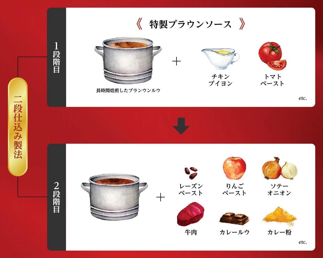 厳選した自社のブラウンルウに、チキンブイヨンやトマトペーストを合わせて煮込むブラウンソースが一段階目となり、そのブラウンソースをベースとしてカレーを製造する製法を二段仕込み製法と言います。ブラウンソースを仕込むひと手間をかけることで、深みのあるおいしさにつながります。