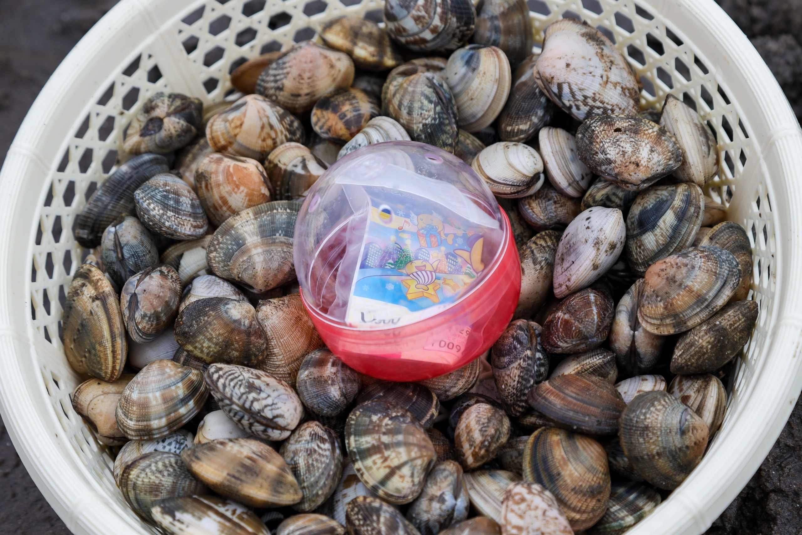身がぷっくりで美味しい富津のアサリは2~10cmの深さに潜っているので浅く広く掘るのがコツ。