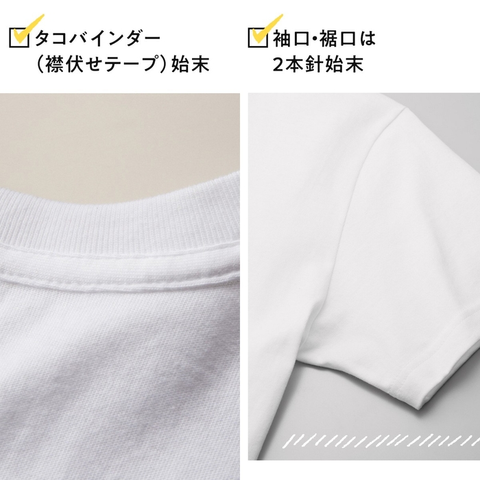 「よれない・透けない・長持ちする」といった三拍子がそろった上質な一枚に仕上げています。丈夫な首もとを実現するため、首まわりの縫製に「ダブルステッチ」を採用。長年愛用いただいてもきちんとした首まわりを保ちます。