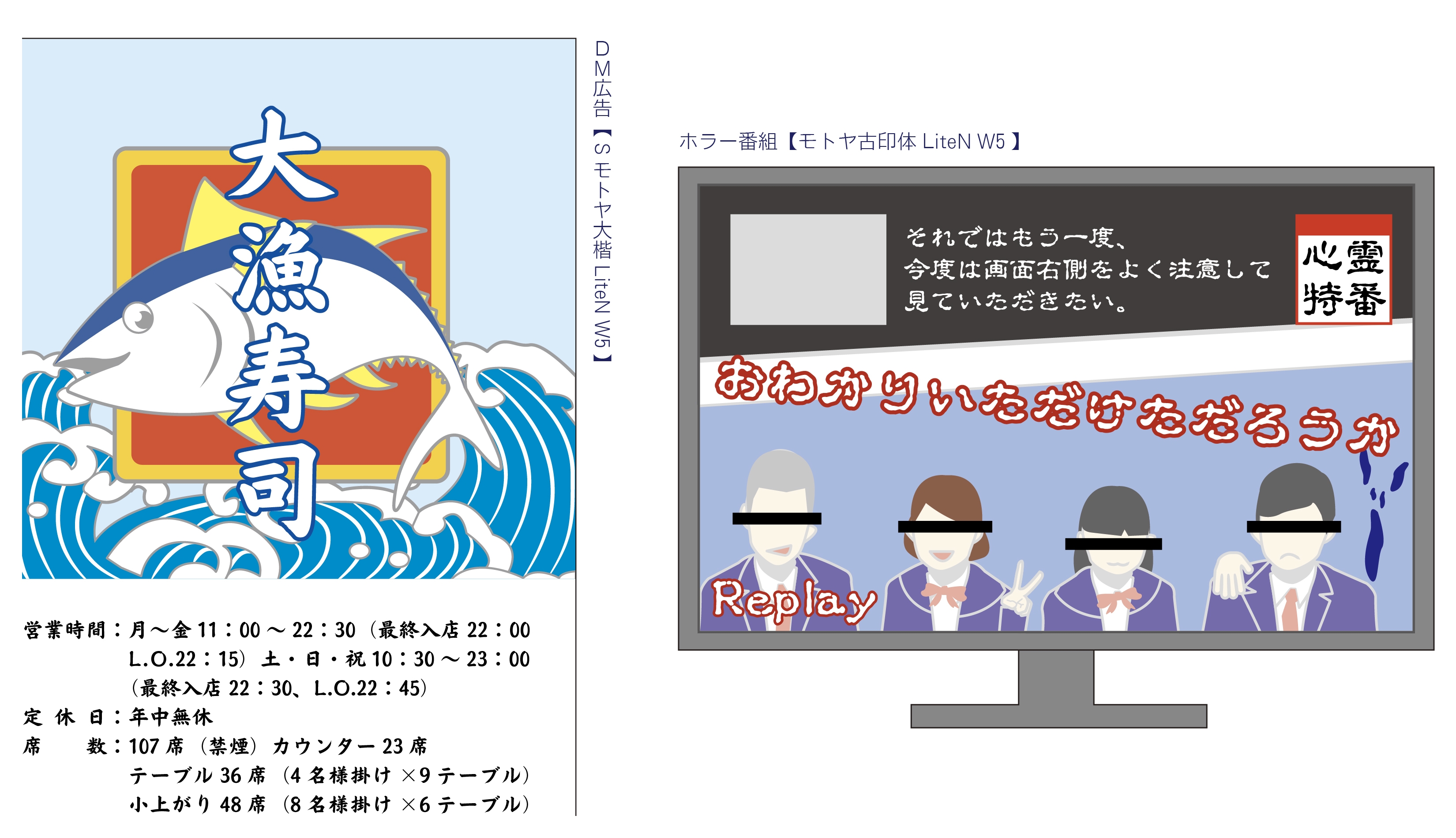 テレビテロップや新聞紙面などにも採用実績があり、映像・動画(画像化して使用)やポスター・チラシのさらなるクオリティアップに役立ちます。
