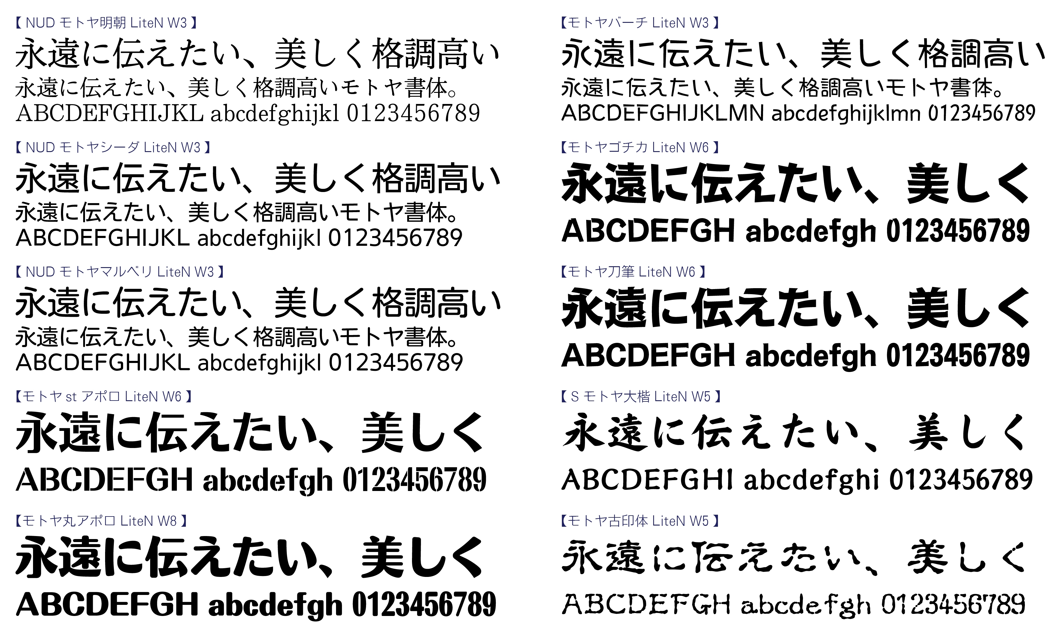 「モトヤフォントlite」では、クリエイティブなシーンでご使用いただけるUD書体やデザイン書体、筆文字書体などのバラエティー豊かな10書体をラインナップしています。