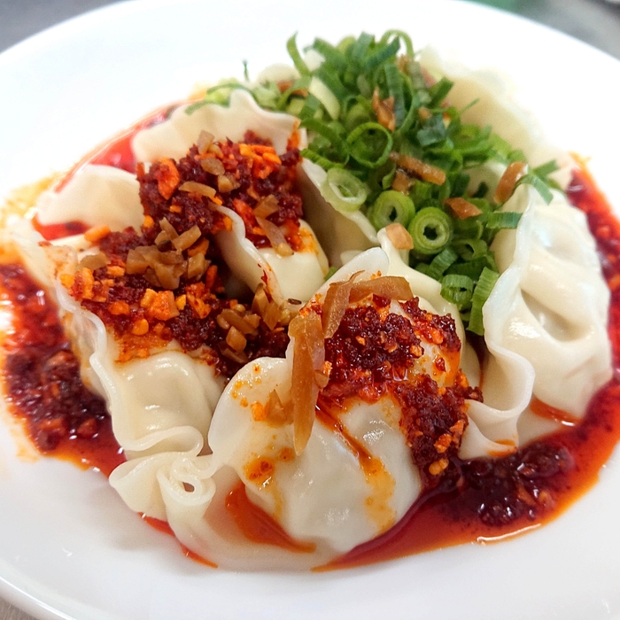 食べるラー油と小口ネギをトッピングした蒸し餃子のレシピです。電子レンジ調理のため時短レシピとなっております。